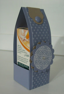 Um bei dem Motto Wellness zu bleiben, habe ich für das kleine Badeöl noch eine Verpackung gemacht. Ihr kennt sie ja schon, ich hatte das schon mal gezeigt (anders gestaltet) als Gastgeschenke bei einem Stempeltreff...